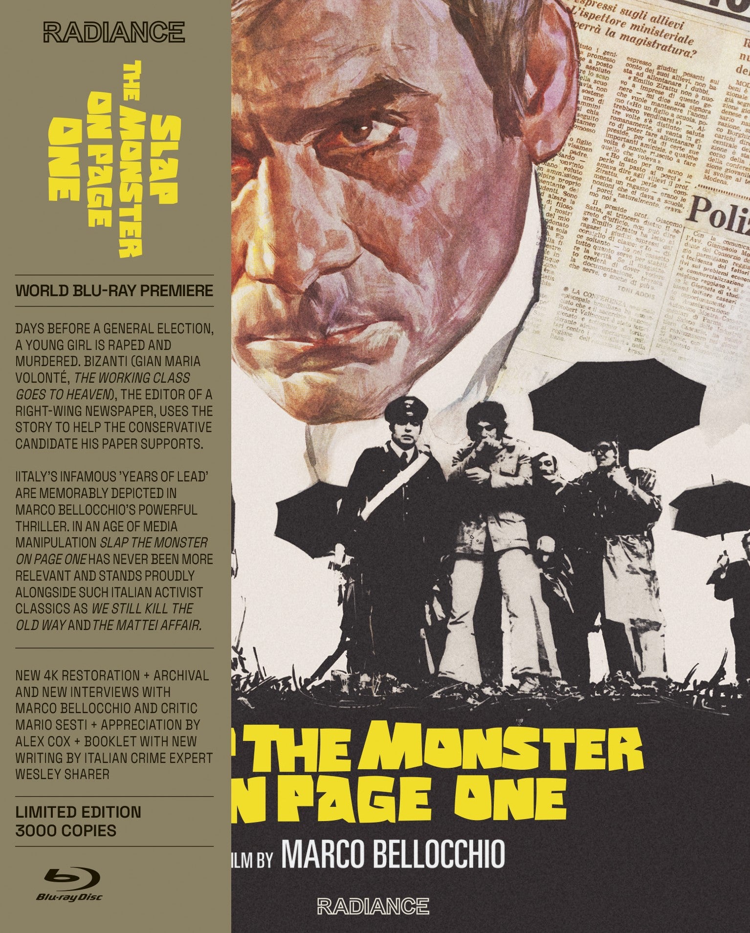 Days before a general election a young girl is raped and murdered. Bizanti (Gian Maria Volonté, The Working Class Goes to Heaven), the editor of a right-wing newspaper uses the story to help the conservative candidate his paper supports. The tumultuous time of Italy's 'Years of Lead' are captured in Marco Bellocchio's powerful political drama which directly addressed topics of its day and even prefigured the creation of the right-wing paper Il giornale, which came into being two years after this film. In an age of media manipulation Slap the Monster on Page One has never been more relevant and stands proudly alongside such Italian activist classics as We Still Kill the Old Way and The Mattei Affair.