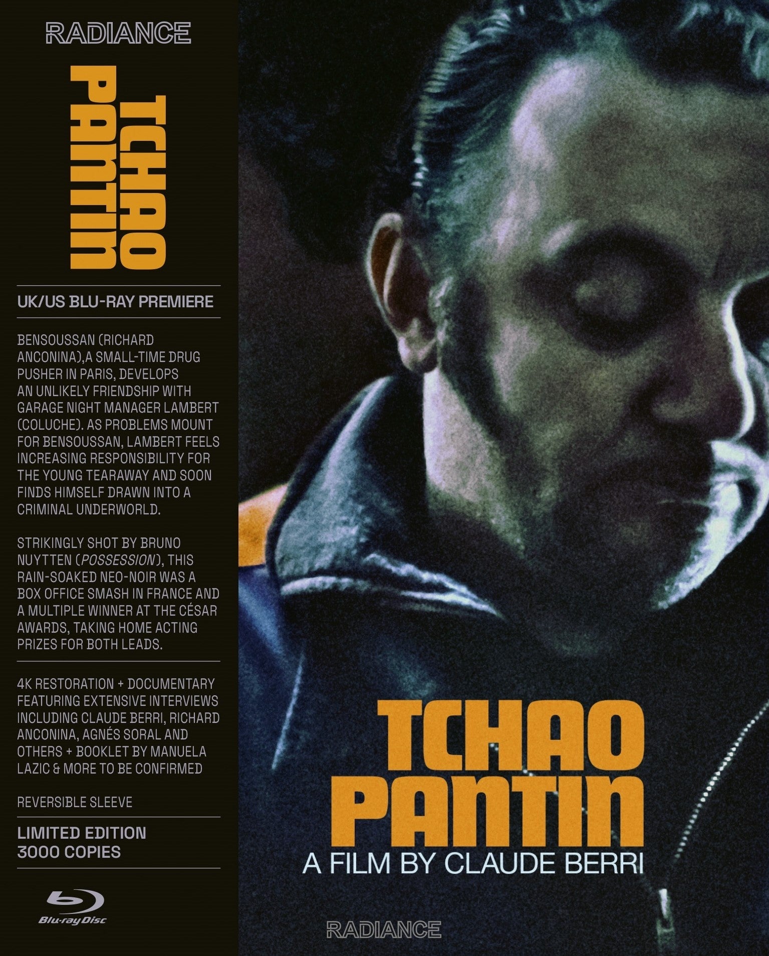Bensoussan (Richard Anconina) is a small-time drug pusher in the 18th Arrondissement of Paris. Being trailed by suspicious patrol cops he takes refuge in a petrol station and strikes up a conversation with night manager Lambert (Coluche). As Bensoussan continues to drop in on Lambert they develop a friendship. But it isn't long before problems arise for Bensoussan and Lambert feels a responsibility to the the young tearaway. Slick and stunningly shot by Bruno Nyutten (Possession), this rain-soaked neo-noir was a multiple winner at the French César Academy Awards taking home acting prizes for both leads, the film anchored by their tender performances. A tale of friendship and revenge set within the fatalistic noir framework. Claude Berri's Tchao Pantin was a box office smash in France. Radiance Films is proud to present Tchao Pantin on Blu-ray for the first time outside of France from a glorious 4K restoration supervised by Nyutten.