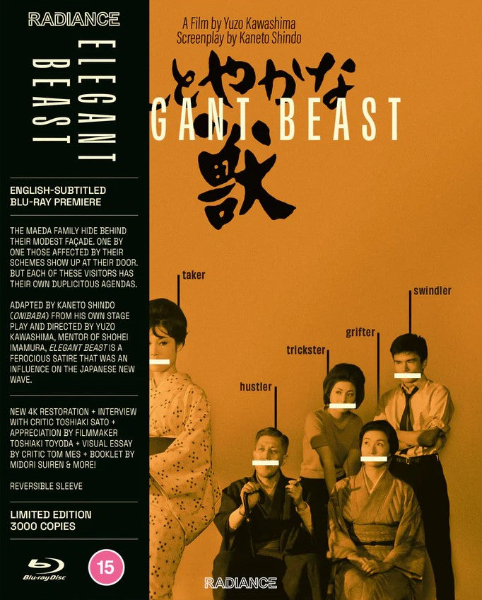 In their humble two-room apartment, the Maeda family seem ever so self-effacing - but their modest façade hides another truth. Daughter Tomoko is the mistress of a bestselling author with well-lined pockets. Son Minoru embezzles funds with his lover Yukie (Ayako Wakao, Red Angel), who has her own hidden agenda. And father Tokizo (Yunosuke Ito, Ikiru, Lone Wolf and Cub) is a former military man who swears he will never return to the poverty he knew during the war, no matter what the cost. One after another, those affected by the Maedas’ schemes show up on their doorstep. But these visitors all have their own duplicitous agendas. With each knock on the door, the gamesmanship reaches a whole new level. Elegant Beast was adapted by Kaneto Shindo (Onibaba, Naked Island) from his own stage play. Director Yuzo Kawashima, mentor of Shohei Imamura and a major influence on the Japanese New Wave, makes magnificent widescreen use of the single apartment setting to deliver a ferocious satire on Japan’s post-war economic miracle.